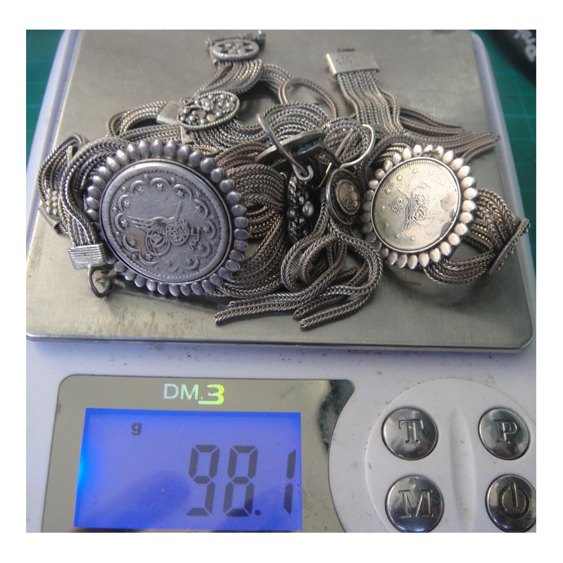 98,1 gram, 925 ayar gümüş, kolye uzunluğu 59 cm, kolye para çap 2,3 cm, osmanlı 5 kuruş kullanılmıştır, bileklik uzunluğu12 cm, bileklik para çap 1,8 cm, osmanlı 2 kuruş kullanılmıştır