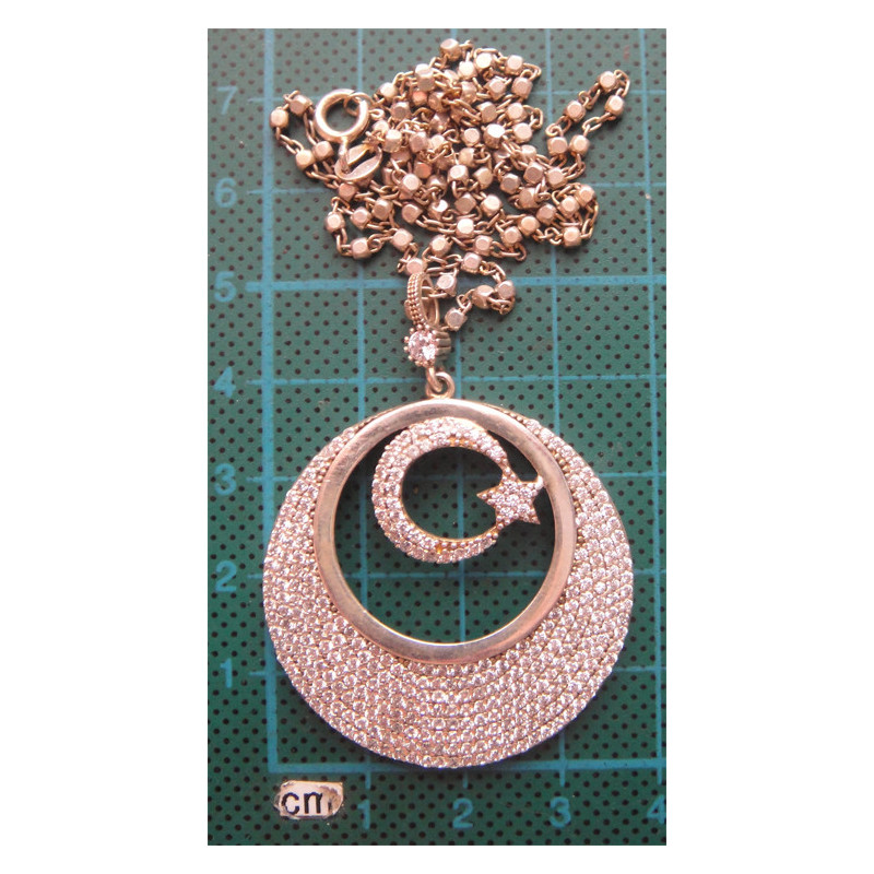 15 gram, 925 ayar gümüştür, zirkon taşlarla bezenmiştir, zincir uzunluğu 50 cm