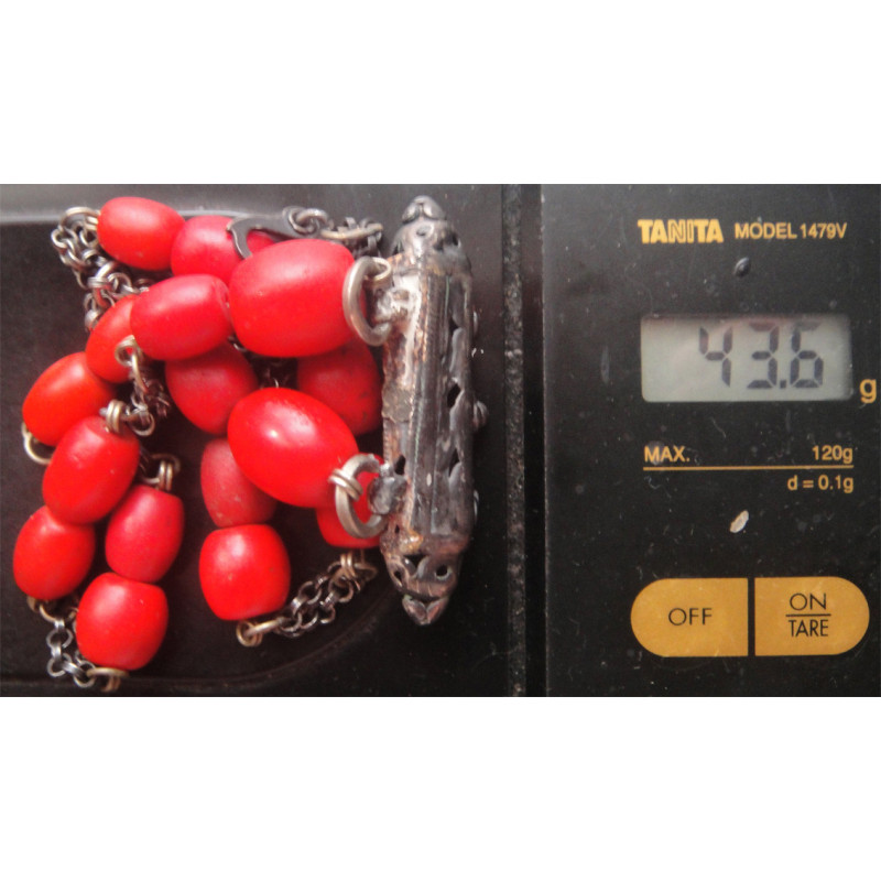 43,6 gram, ayar damgası yok ancak gümüştür, kolye uzunluk 45 cm