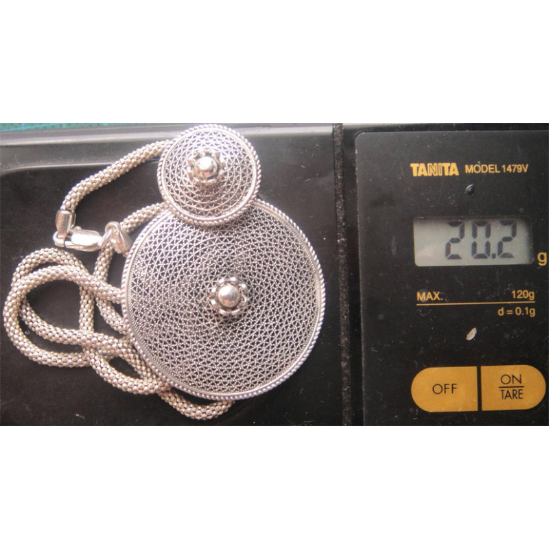 20,2 gram, 925 ayar gümüştür, zincir uzunluk 43 cm, alt parça çap 4 cm, üst parça çap 2 cm