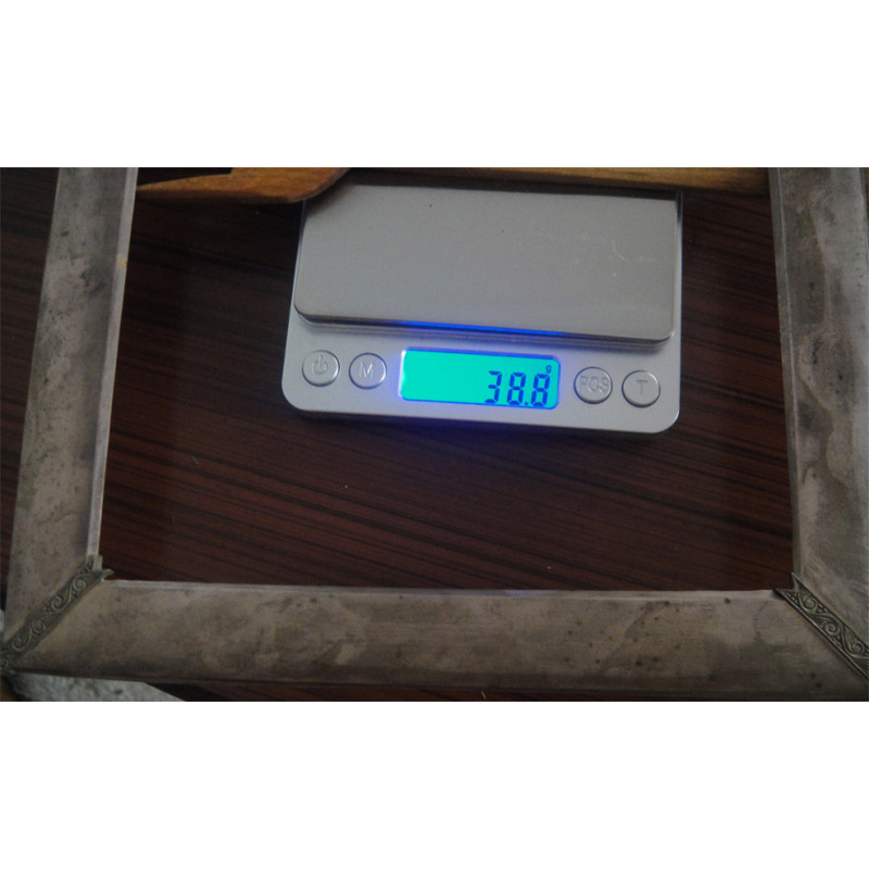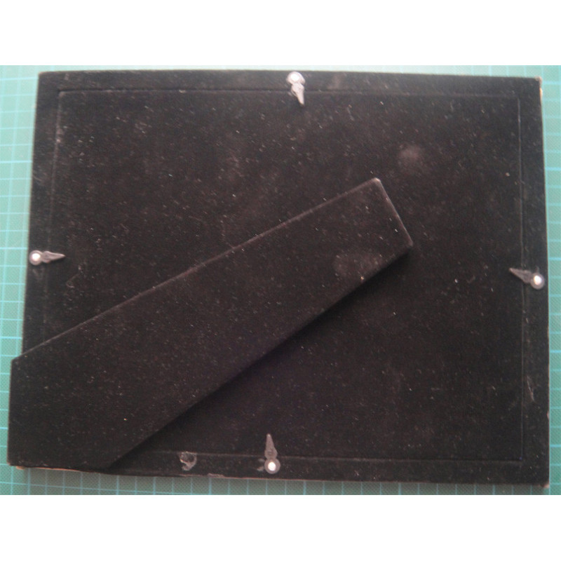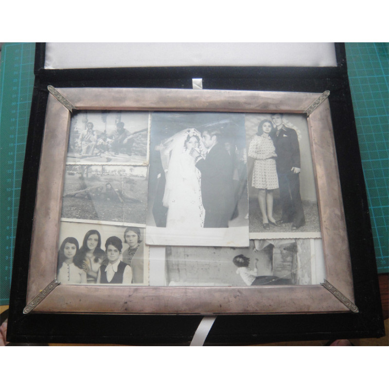 Çerçeve gümüş kısmı net ağırlık 38,8 gramdır. 925 ayar gümüştür. Çerçeve dış ölçüleri en 22 x boy 28 cm. Resim konacak kısım ölçüleri 16,7 x 23 cm. çerçeve kalınlık 1,5 cm. Kutu siyah Kadife Kaplanmıştır. Üzerinde hafif lekeler vardır. Kutu ölçüleri 26,6 x 32 cm. Kutu kalınlık 4,2 cm.