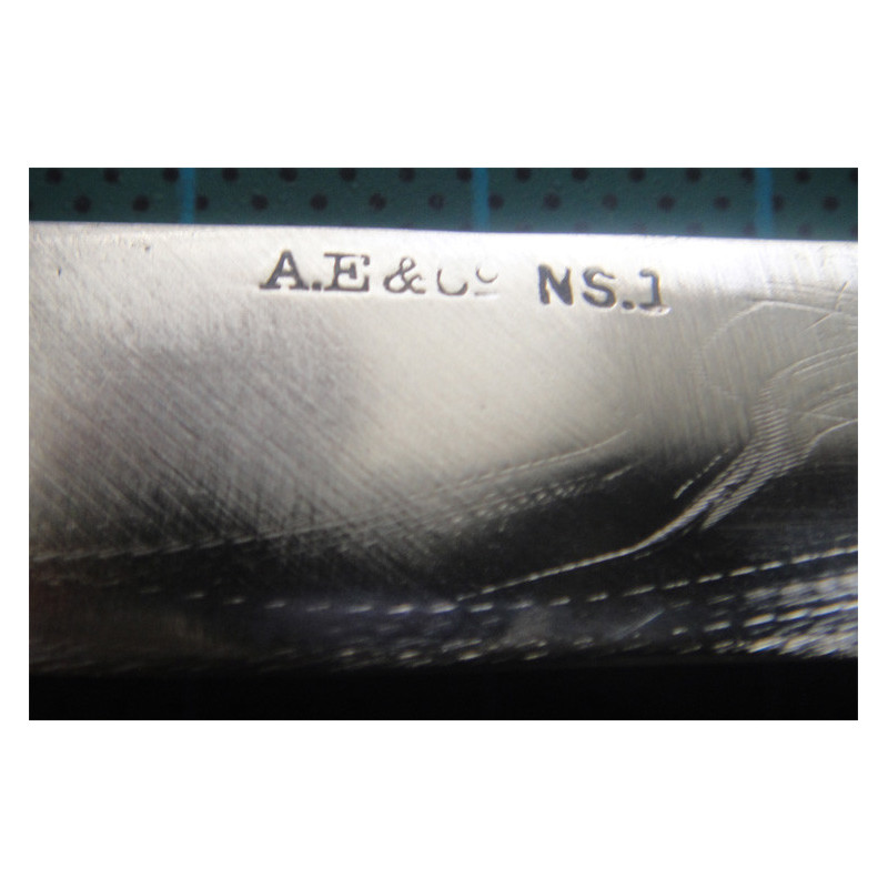 A.E.&Co damgalı. Gümüş ayarı yok ancak sap kısmı gümüştür. Uzunluk 17,5 cm