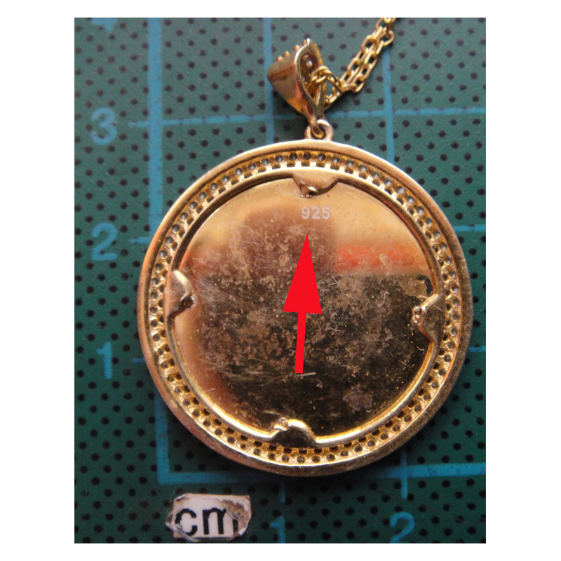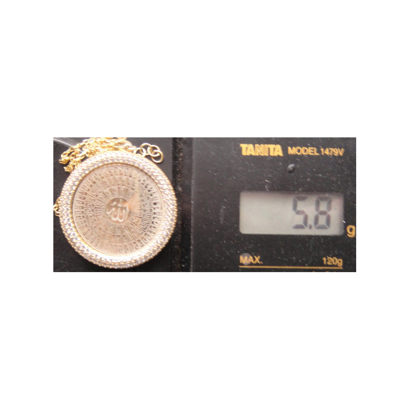 5,8 gram, 925 ayar gümüştür, altın suyuna batırılmıştır, zincir uzunluğu 40 cm