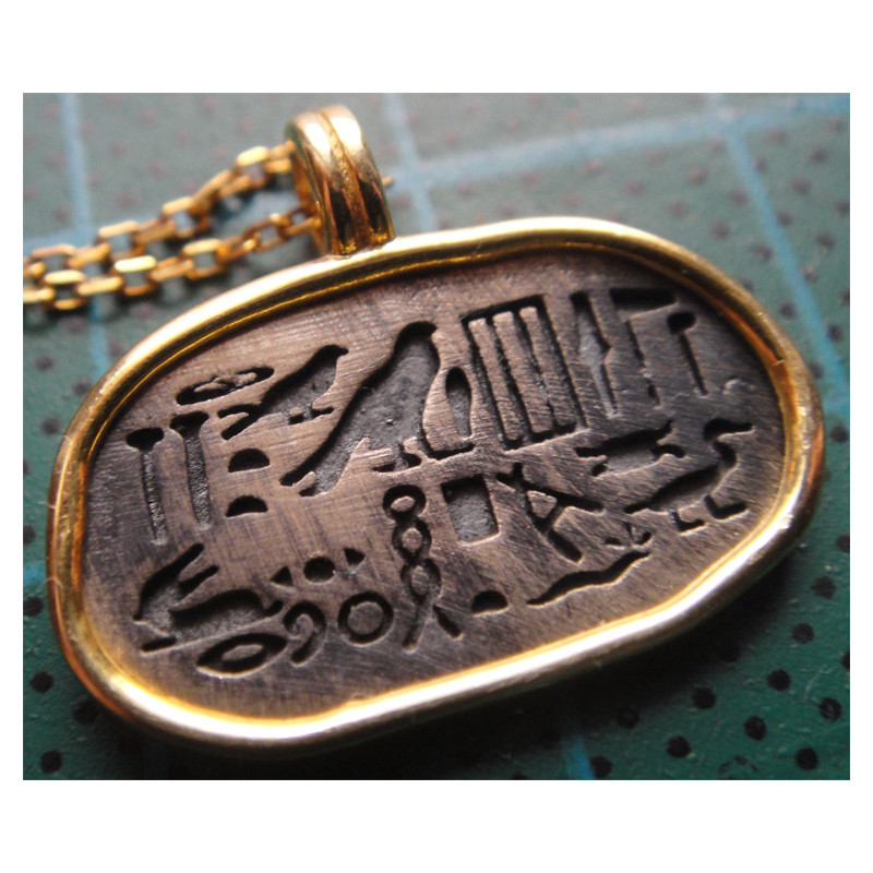 Bu kolye ucu Antik Mısır esintili bir “kartuş” (cartouche) şeklinde yapılmış görünüyor.