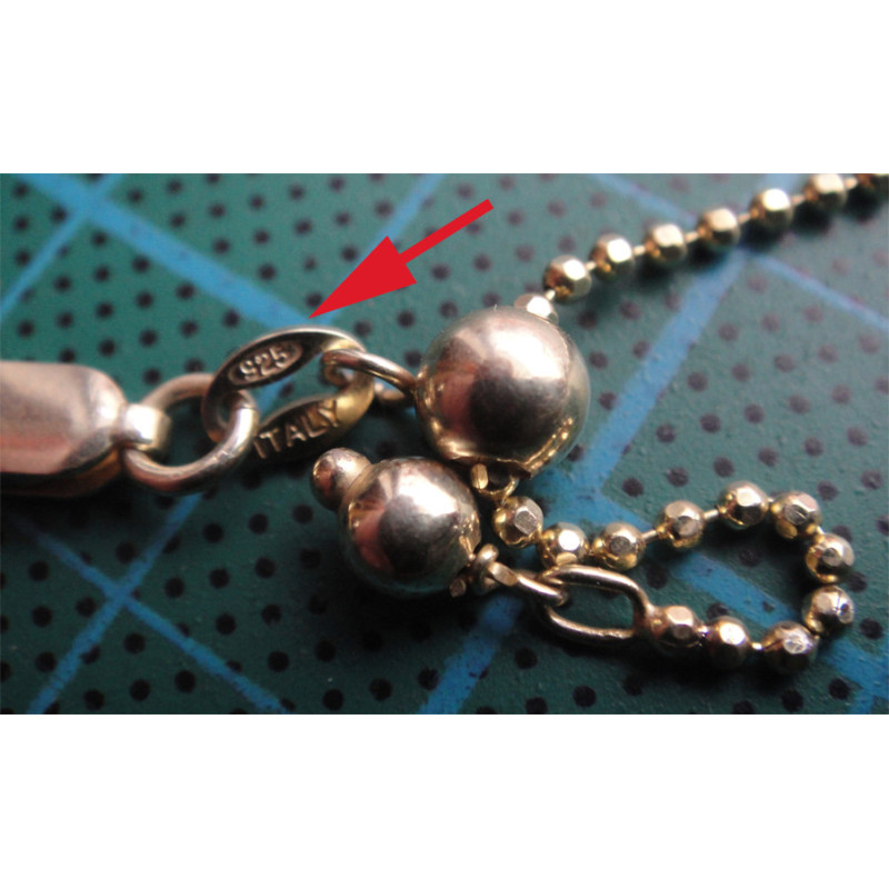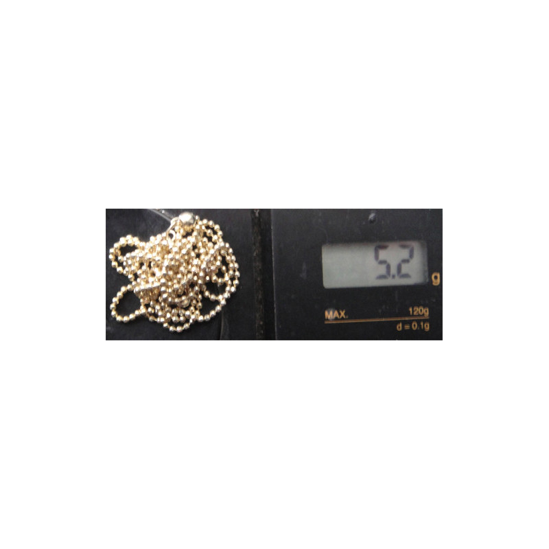 5,2 gram, 925 ayar gümüştür, altın suyuna batırılmış, zincir uzunluk 73 cm, ancak asansörlü olduğu için ayarlanabilir, top çapı 1 mm