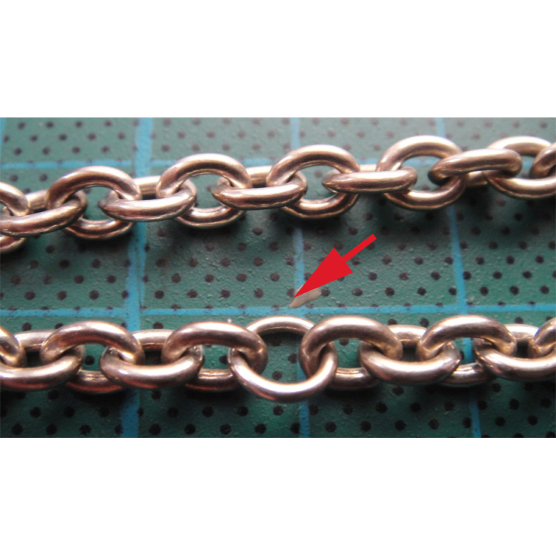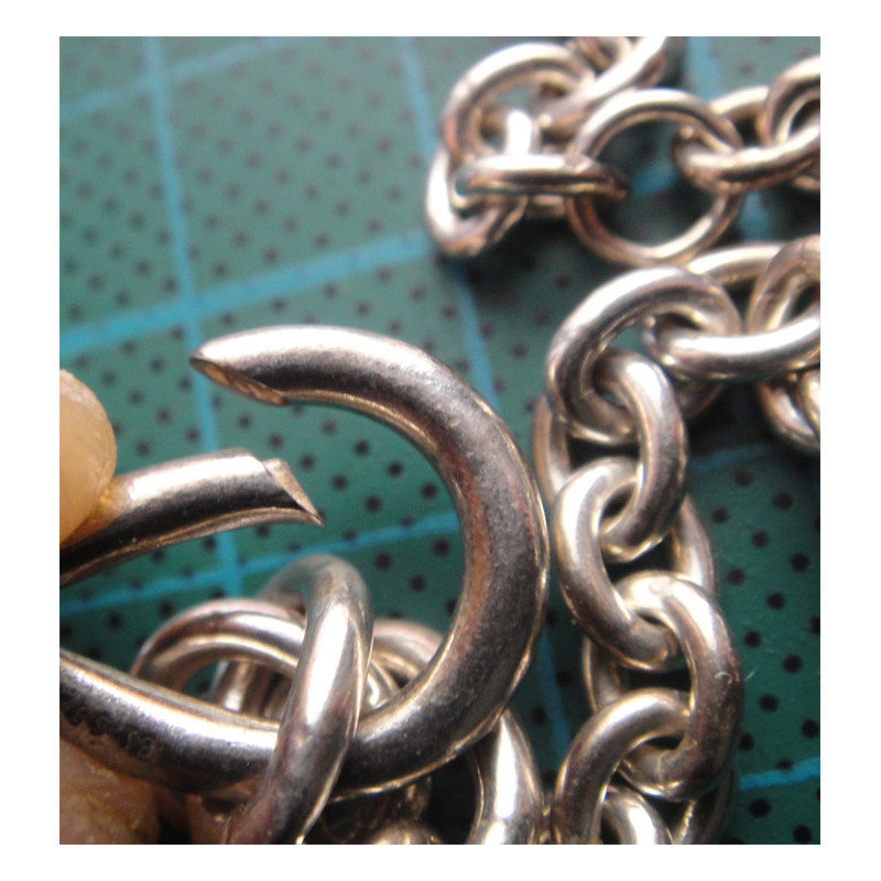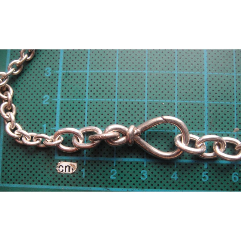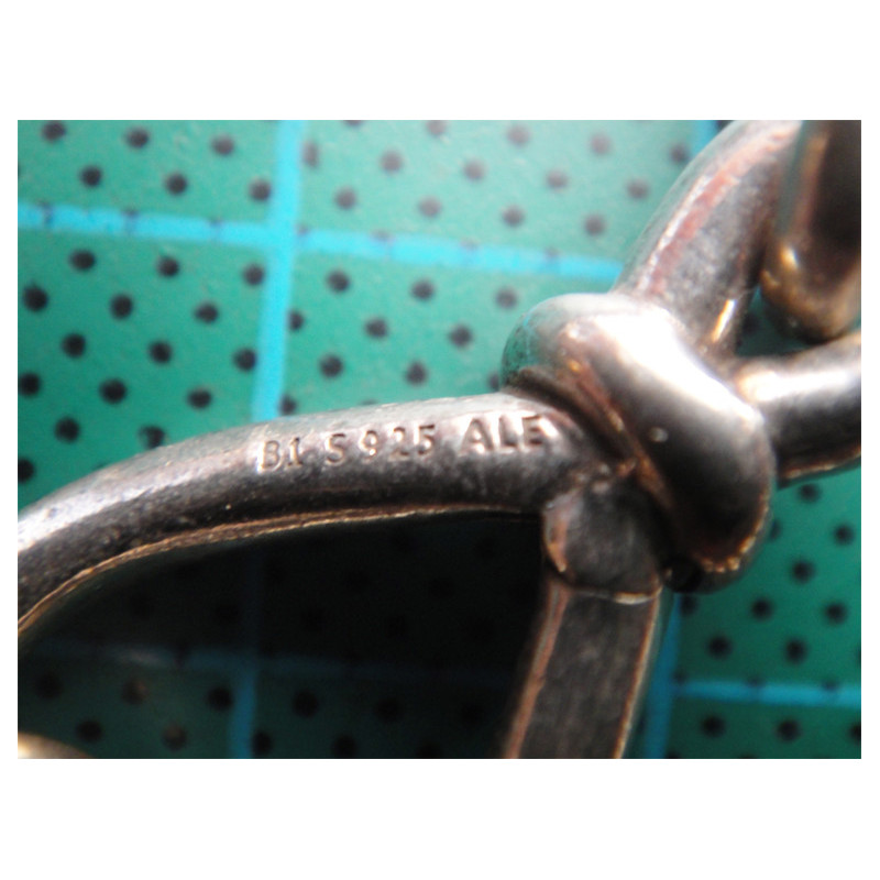 31,9 gram, 925 ayar gümüştür, toplam uzunluk 50 cm, halkalardan birinin üzerinde "PANDORA" yazmaktadır, halkalar orta kısımdan başlayıp kilit kısmına doğru incelmektedir, kırmızı okla gösterilmiş 2 halka çapı farklıdır