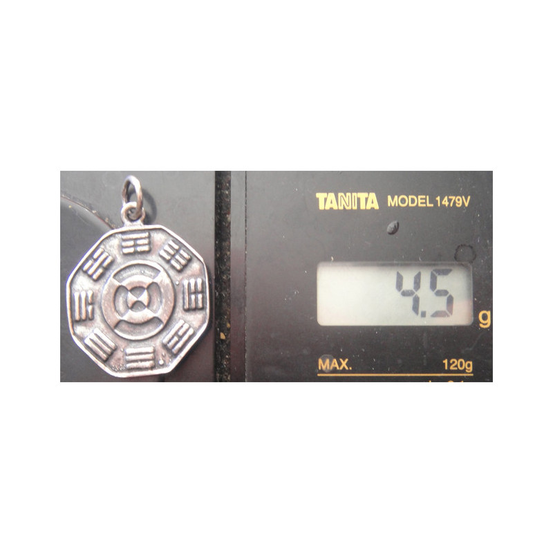 Bagua (八卦) sembolü taşıyor. Çin felsefesi, Taoizm ve Feng Shui’de çok önemli ve yaygın bir semboldür.
