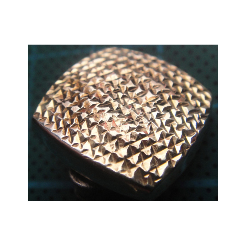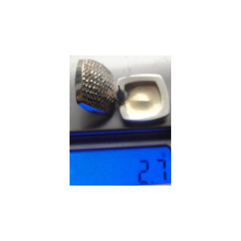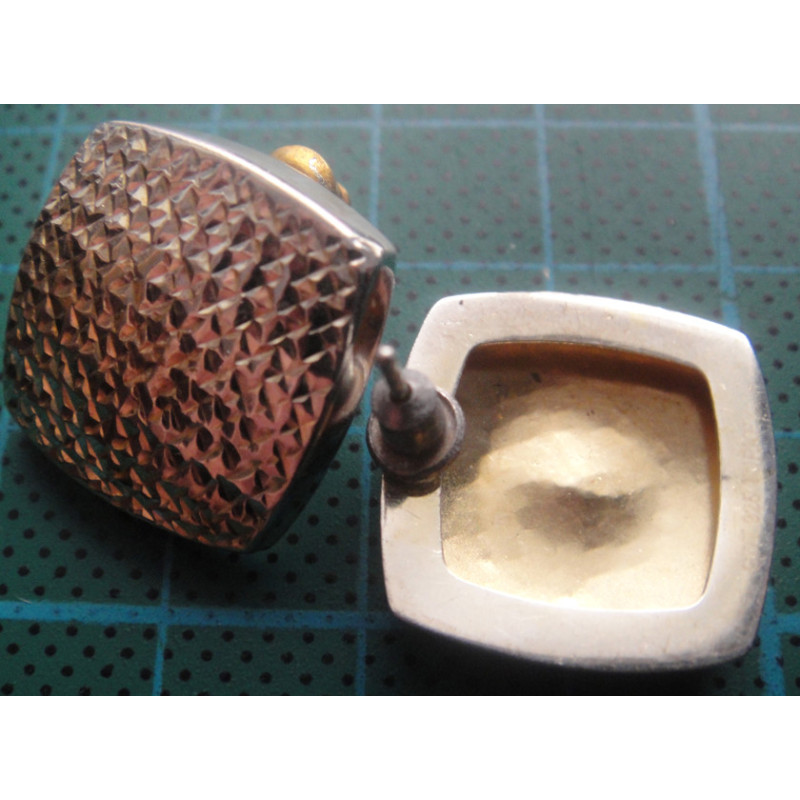 2,7 gram, 925 ayar gümüştür, altın suyuna batırılmış, küpe arka kilitlerinden (klips) biri beyaz renklidir, üst ölçü 1,8 x 1,8 cm