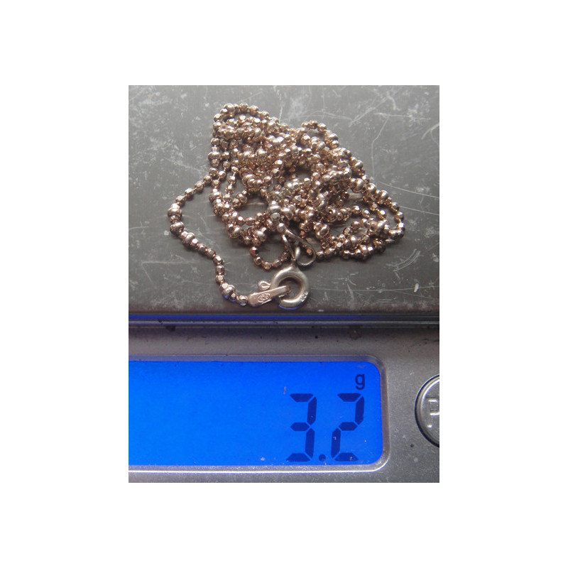 3,2 gram, 925 ayar gümüştür, altın suyuna batırılmış, zincir 3 top sonrası tek top halinde sıralı, zincir uzunluk 46 cm, top en 1,8 mm